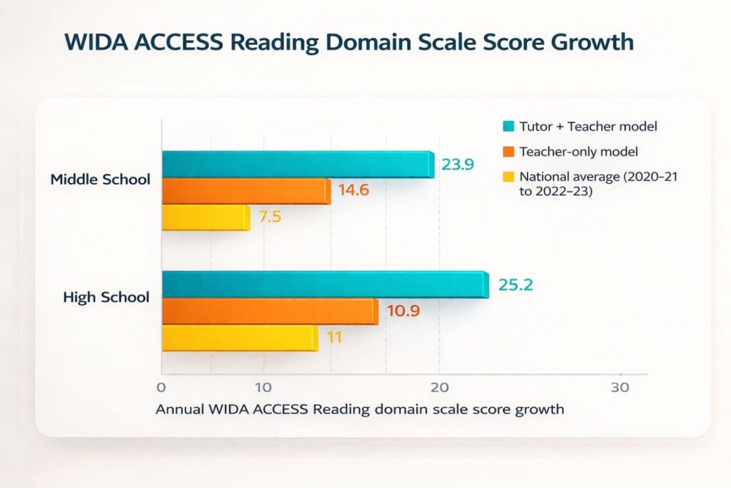 The result: doubling English proficiency gains compared to national averages, as measured by WIDA ACCESS Reading. The approach was also highly cost-effective: at $665 per pupil, it required only about one-third of the funding typically provided to districts through federal Title III grants and state EL/MLL support programs.
